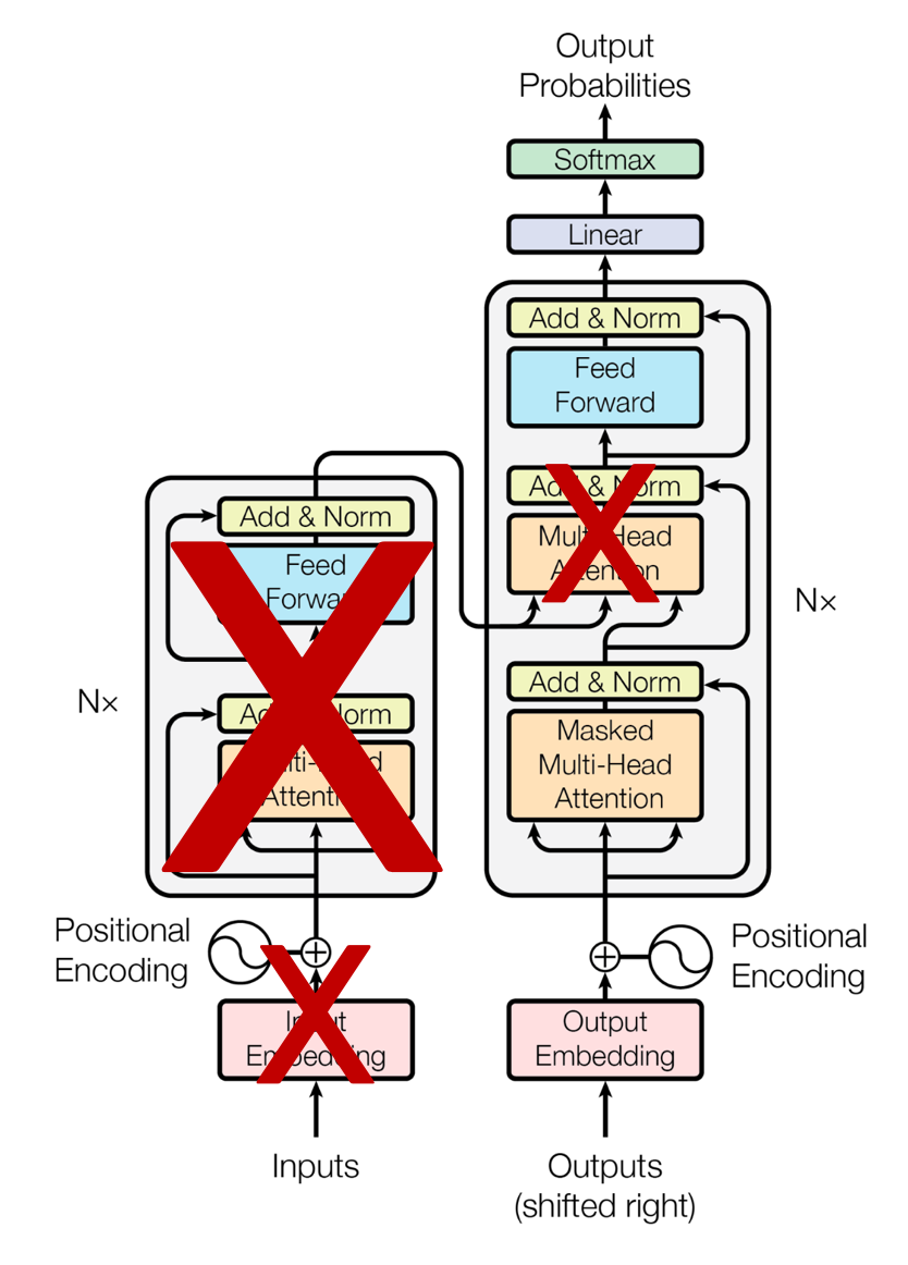 표준 Transformer의 Decoder만 사용하므로 Decoder에서 Encoder의 출력과 Attention을 하는 부분인 Encoder-Decoder Multi-Head attention 부분을 제거하였다.